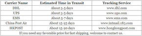 4. Normalmente, i pacchi verranno inviati tramite posta aerea cinese, che richiederà 15-25 giorni lavorativi a seconda del paese, delle condizioni meteorologiche, delle festività e così via.Se hai bisogno di articoli in fretta, contattaci per un altro metodo di consegna (come di seguito), che richiede TARIFFA EXTRA.