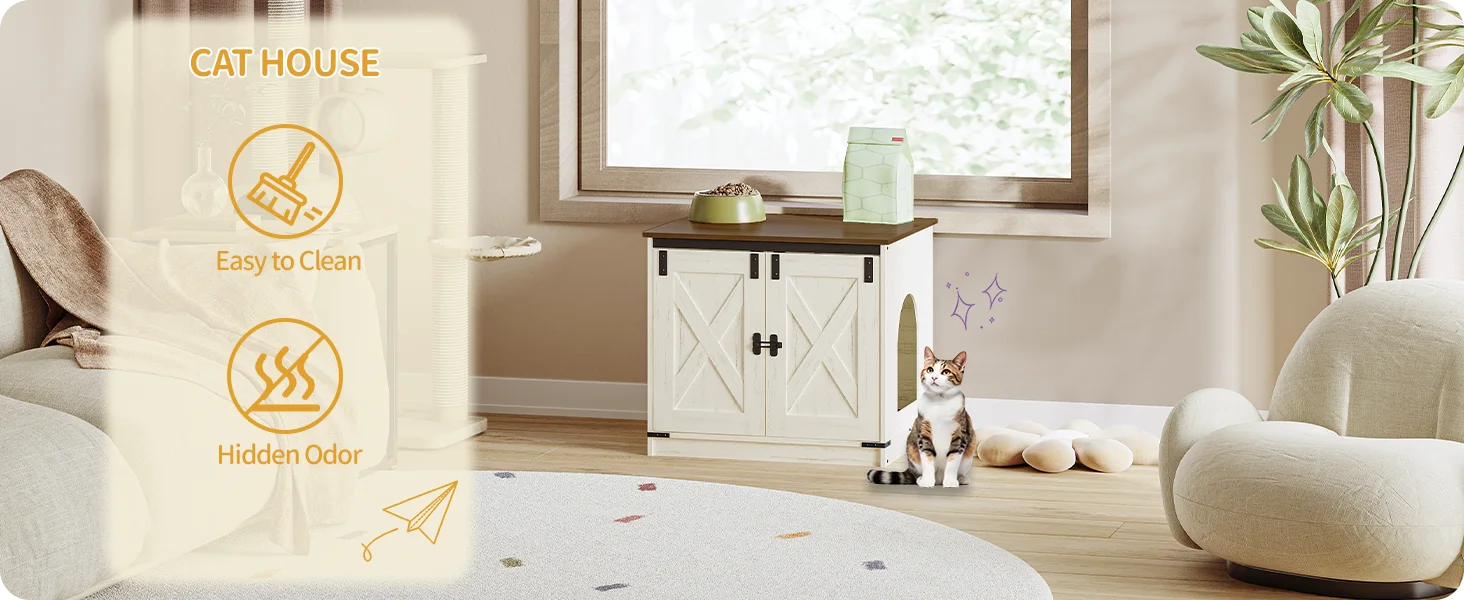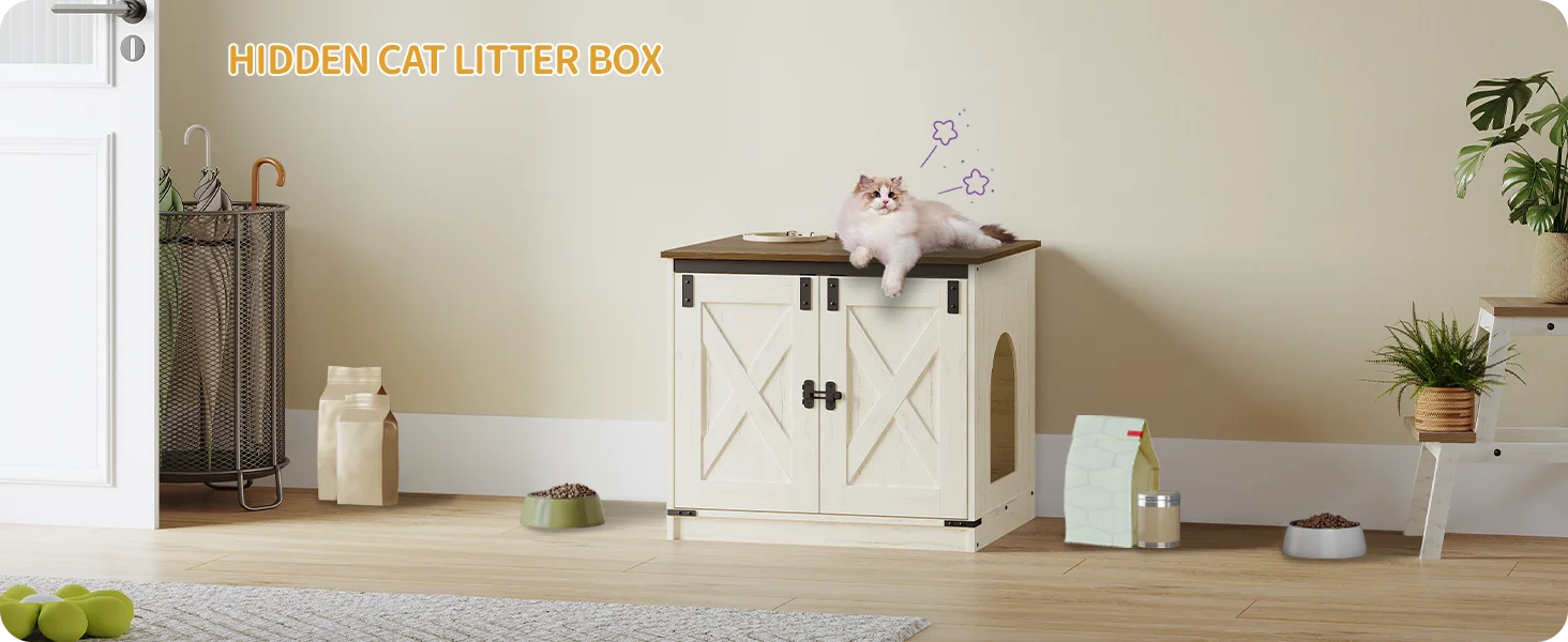MOBILE PER ANIMALI MULTIFUNZIONALE: Non solo funge da mobile per lettiera per gatti, ma può anche essere utilizzato come cuccia per gatti o tavolino laterale. Lo stile rustico e il design unico con porta a fienile si abbinano perfettamente alla maggior parte degli stili di arredamento.