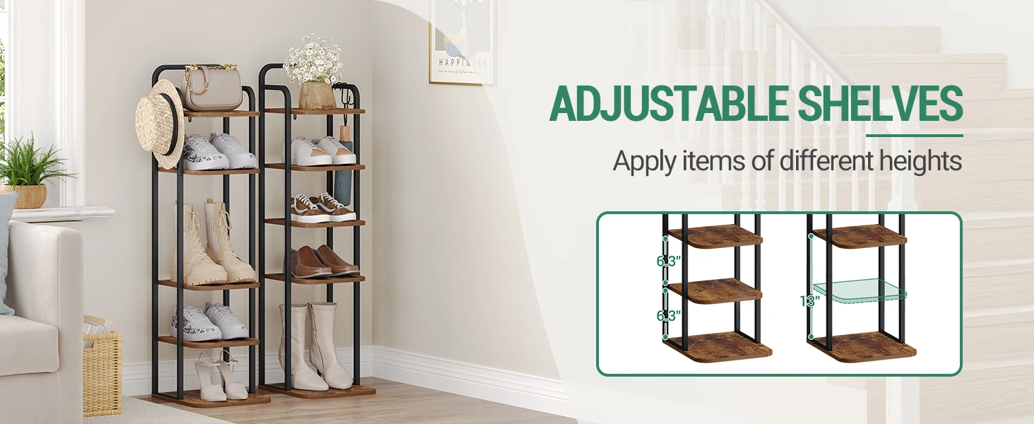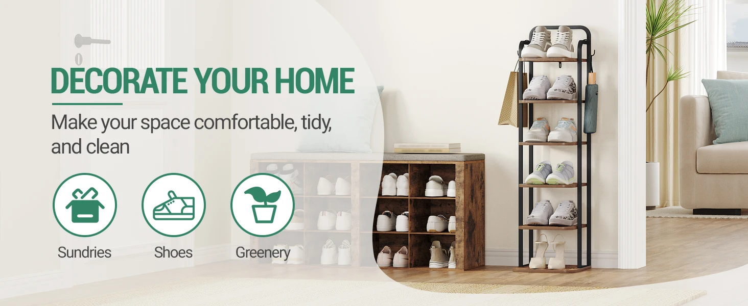 Non solo una scarpiera: solo una scarpiera?No, questo scaffale indipendente a 6 livelli può essere utilizzato anche come supporto per piante, per foto, ecc.Ha molteplici usi.I ganci su entrambi i lati della scarpiera possono appendere ombrelli, borse o altri oggetti