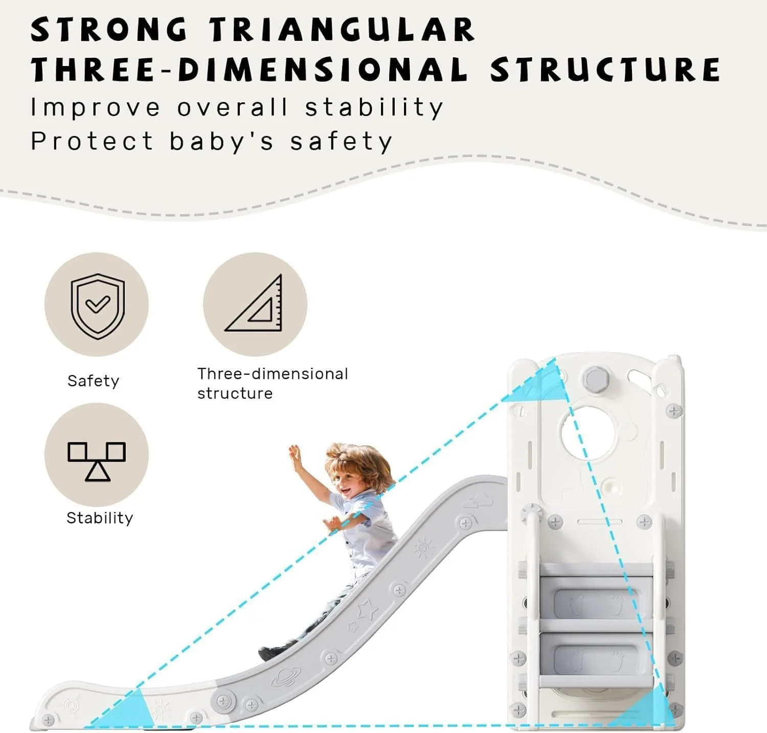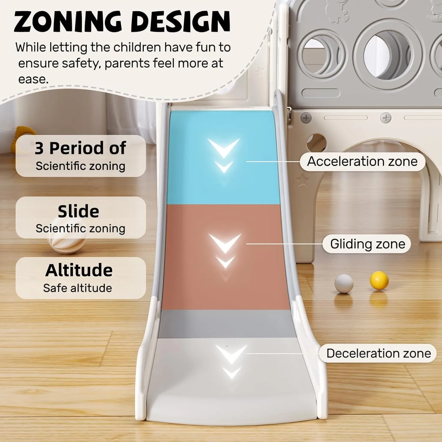 【Costruzione sicura】 Ha una struttura triangolare stabile per garantire la stabilità della diapositiva pieghevole.Spazio scorrevole a tre stadi, accelera, ammorbidisce e ammortizza in modo che i bambini atterrino in sicurezza.Lascia che i bambini si divertano giocando felicemente senza il rischio di alcun incidente.