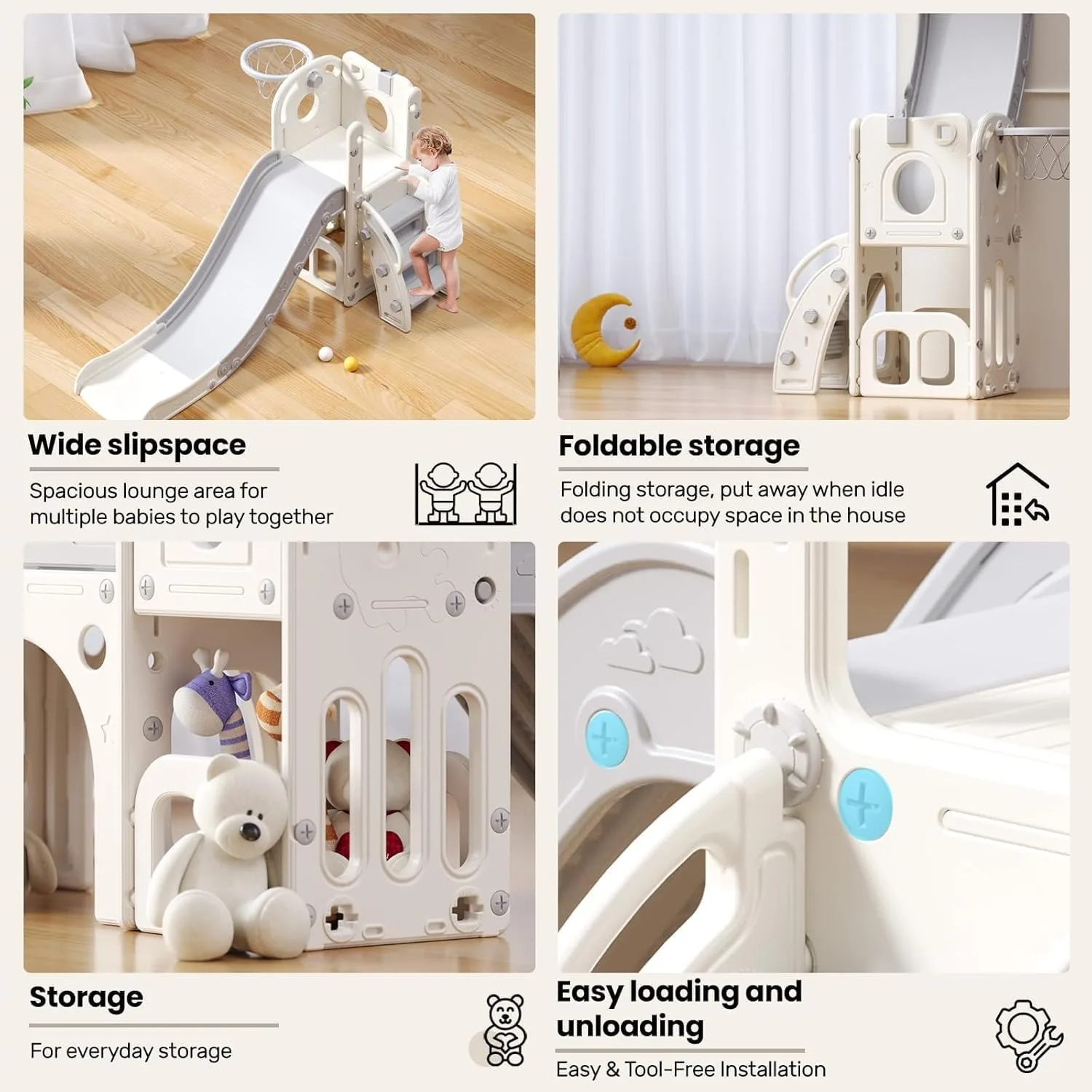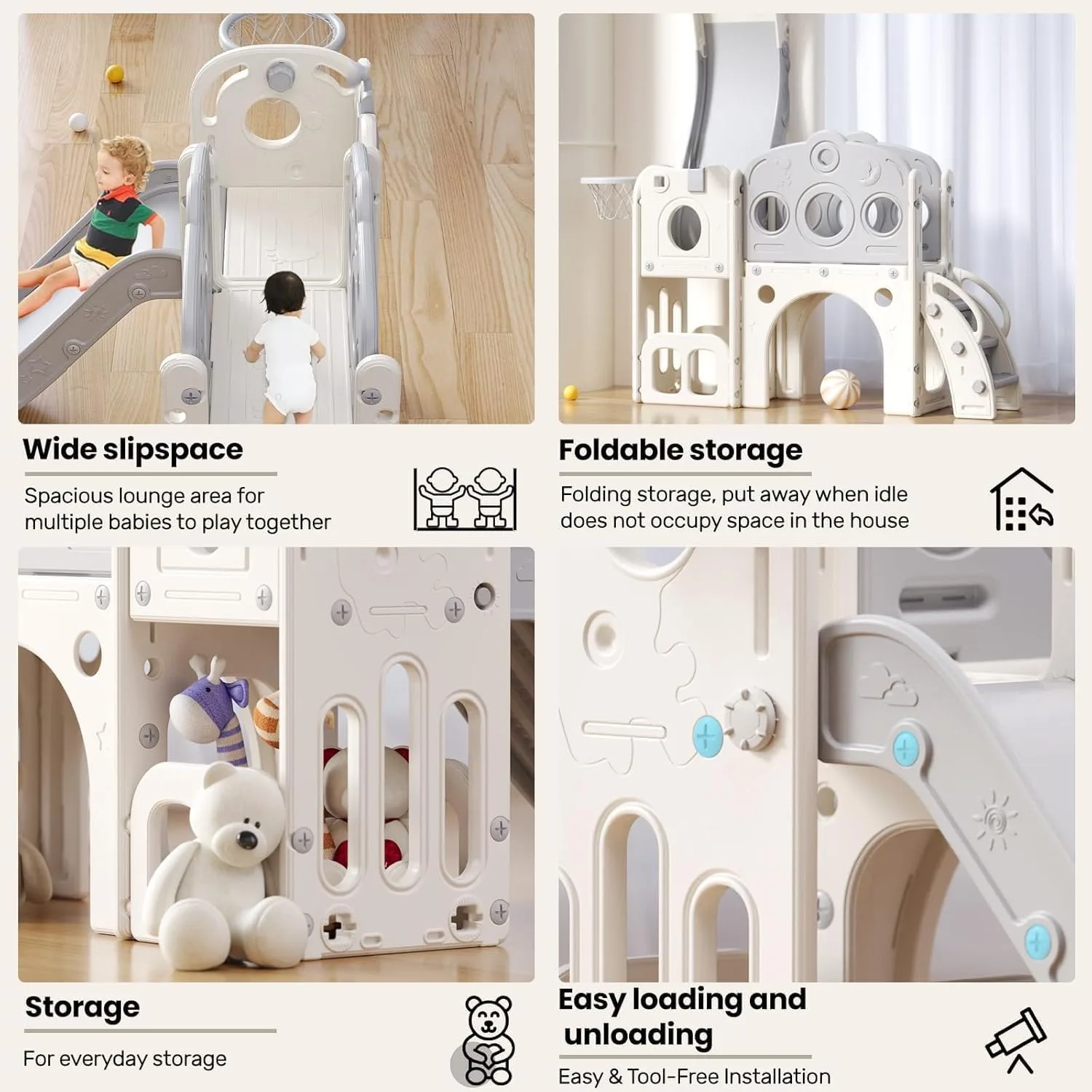 【Slide 4 in 1】 Il nostro scivolo per bambini ha una scala da arrampicata con parapetti, uno scivolo, una recinzione di sicurezza, un contenitore e un canestro da basket.Può allenare le capacità atletiche di tuo figlio e dargli a tuo figlio un corpo sano e un'infanzia felice.